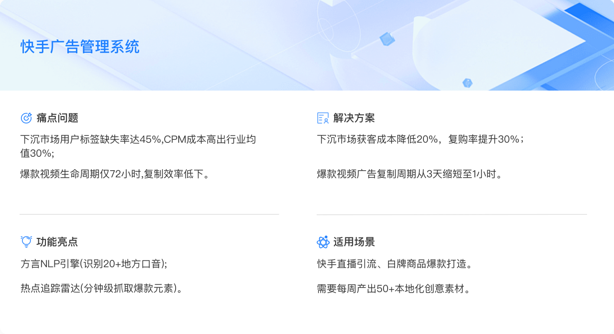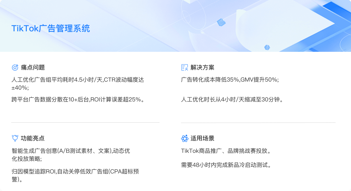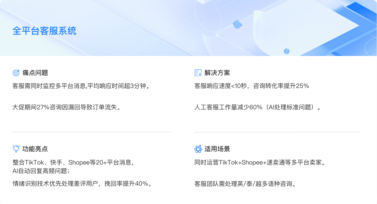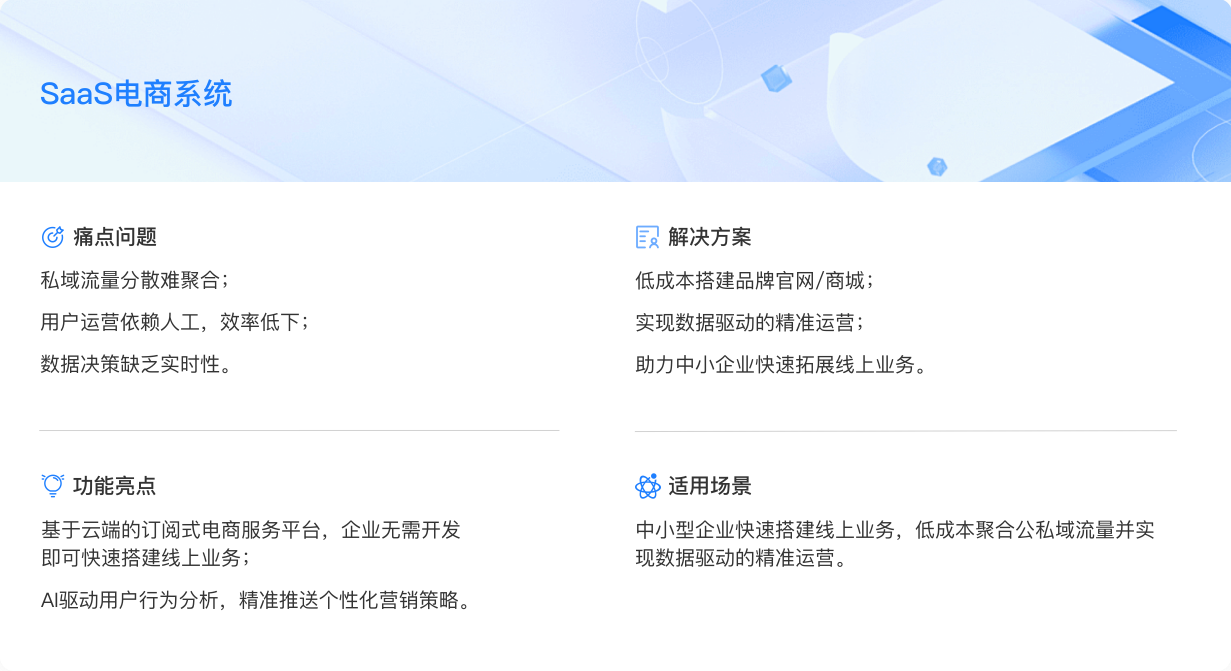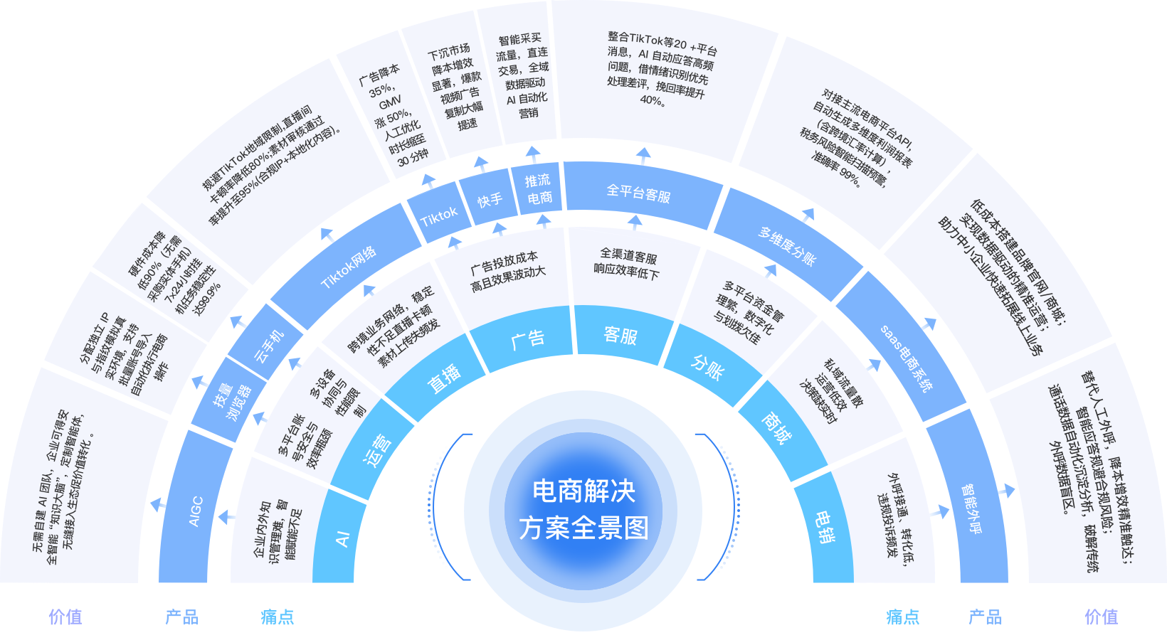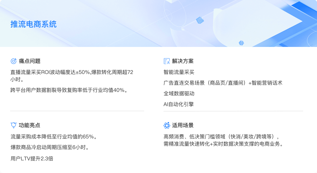 电商行业正面临流量成本高企、用户转化乏力、供应链效率低下、数据孤岛明显等核心痛点,同时需应对消费升级与竞争加剧的双重挑战。助力电商解决方案含 11 大产品,通过数据驱动实现精准获客、转化提效与供应链优化。